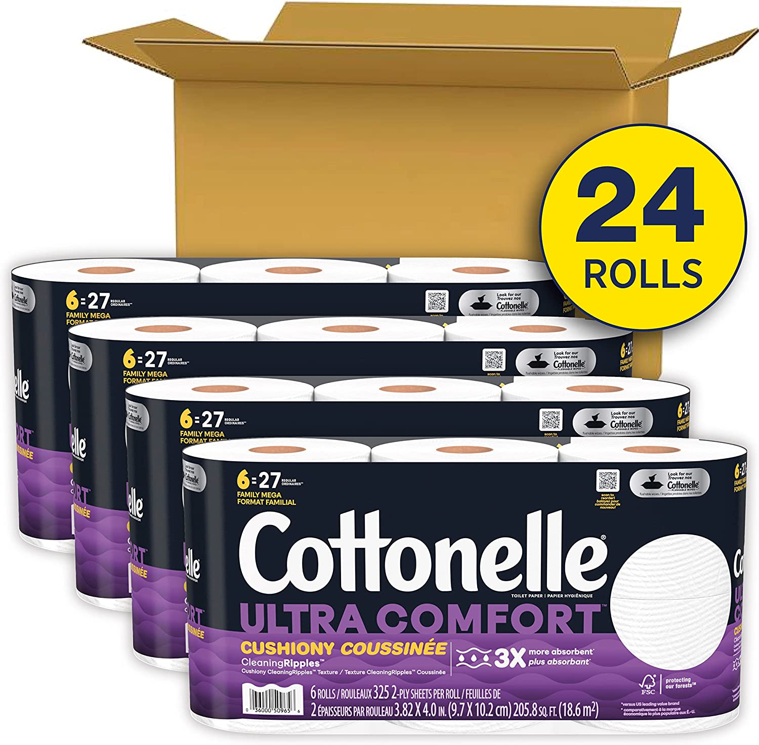 • 24 FAMILY MEGA ROLLS: Cottonelle Ultra Comfort Toilet Paper with Cushiony CleaningRipples Texture, 24 Family Mega Rolls (4 packs of 6); 325 sheets per roll .